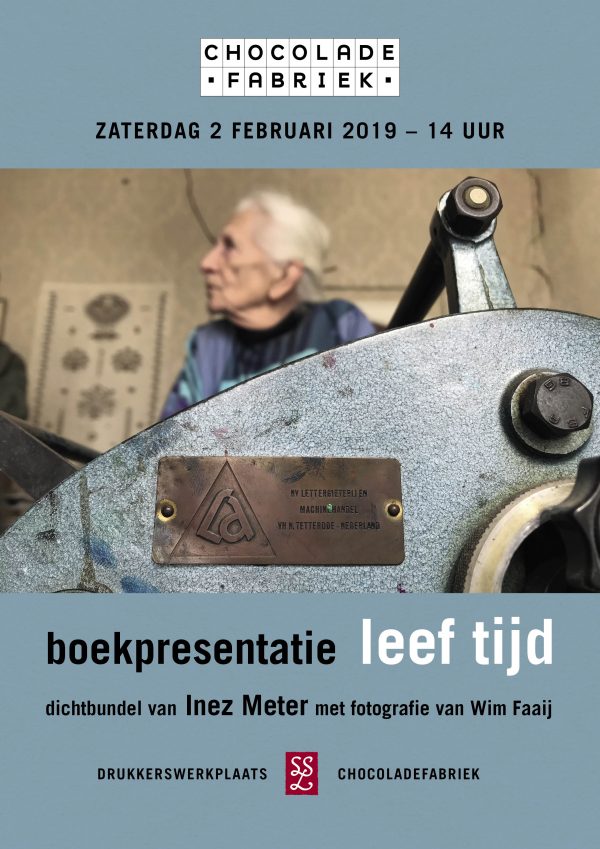 Op zaterdag 2 februari 2019 presenteert de Drukkerswerkplaats Gouda de bundel leef tijd. Deze bundel bevat een tiental gedichten uit het uitgebreide oeuvre van Inez Meter. De gedichten worden in een bijzondere bibliofiele uitgave gecombineerd met landschapsfoto’s van Wim Faaij…. Verder lezen →