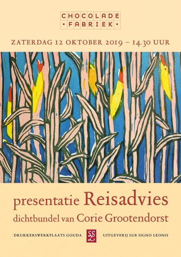 Op zaterdag 12 oktober 2019 presenteert de Drukkerswerkplaats Gouda Reisadvies. Een dichtbundel met zestien nieuwe gedichten van Corie Grootendorst. De gedichten worden uitgegeven in een bijzondere bibliofiele uitgave. Ursula Steenaart maakte voor de omslag een linoleumsnede in 5 kleuren. Grafisch ontwerper Peterpaul Kloosterman… Verder lezen →